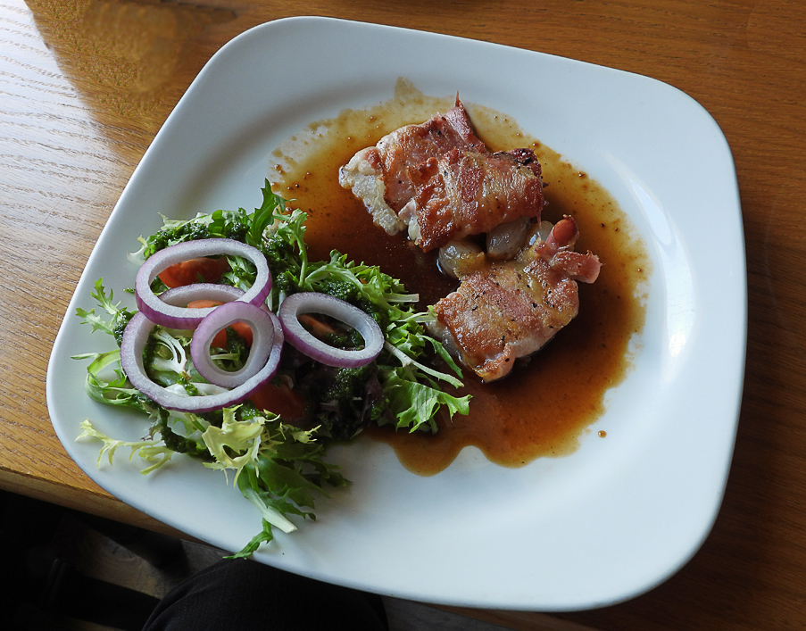 - Scheiben vom Quargel in Baconscheiben einwickeln und sanft in Butterschmalz braten. Mit Salat und Brot servieren