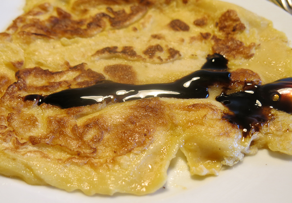 Pfannekuchen gibt es bei uns im Münsterland salzig und süß. Die salzigen Pfannekuchen wurden oft als Fleischersatz mit Kartoffeln, einer sauren Specksauce und Salat oder zu einem Schnippelbohneneintopf gegessen. Und da jetzt die beste Zeit für Boskop Äpfel ist, mache ich mir einen Apfelpfannkuchen mit Äpfeln und Speck. Ich mache genug Teig, damit zu Schluss noch ein kleiner Pfannekuchen übrigbleibt, den ich als Dessert mit Rübenkraut esse. Jenseits der Grenze heißt dies süße, jeden Zahnarzt in den Wahnsinn treibende, klebrige Zeug „Suikerstroop“. Den Werbespruch „Suikerstroop is heerlijk op de pannenkoek en op brood“ kann ich noch Jahrzehnte nach meiner Kindheit für mich stehen lassen.
