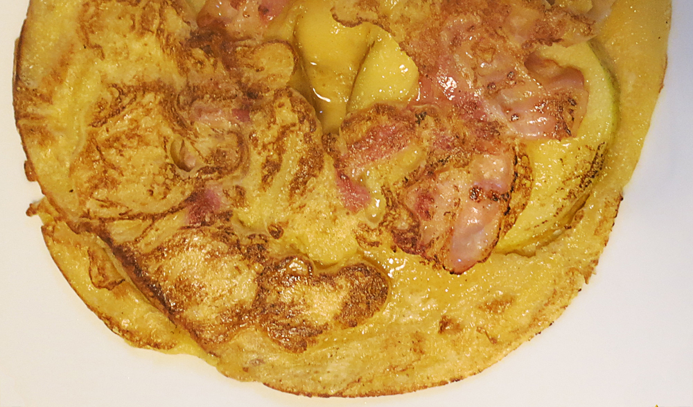 Die Äpfel waschen, die Schale bleibt daran und die Äpfel in 2 – 3 mm dicke Scheiben schneiden. Den Bacon in Quadrate schneiden und in die heiße Pfanne geben, wenn er braun ist, wenden und die Äpfel dazugeben. Manchmal hat der Speck genügend Fett, um den Pfannekuchen zu backen, wenn nicht, gibt man etwas Butterschmalz dazu. Dann kommt der Pfannkuchenteig darüber.