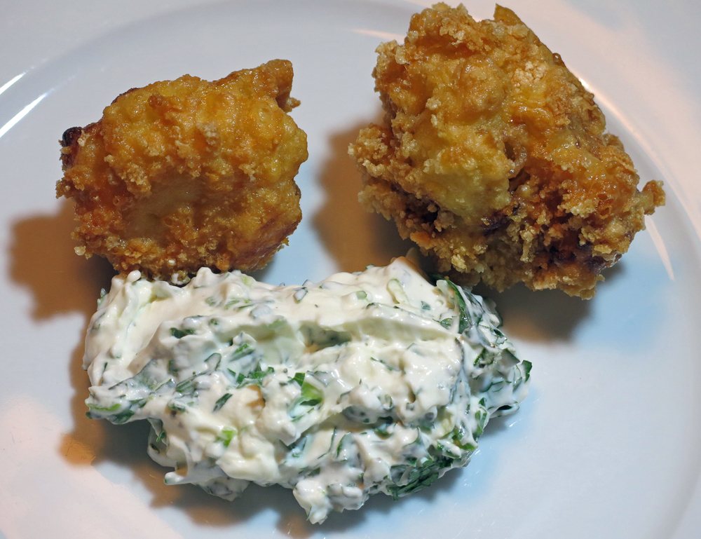Frisch ausgebacken, goldgelb auf den Tisch und dazu einen Kräuterdip.