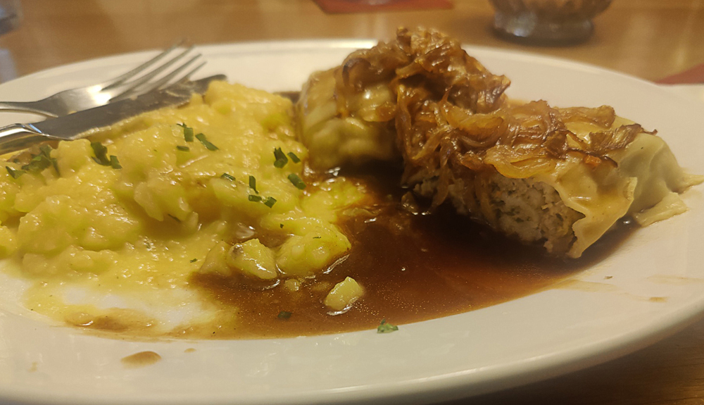 Am Abend wurde in einem sogenannten noblen Restaurant als Vorspeise (Suppe) eine Abart des Gaisburger Marsch angeboten. Logischer weise hieß dieser Eintopf lokal eingefärbt Backnanger Marsch. Und wäre ich nicht am Vormittag im Storchen belehrt worden, dass es sehr gutes Essen in Schwaben gibt, hätte ich sofort das alte Vorurteil wieder zum Leben erweckt und leise gemurmelt: „Diese Abart ist ganz schön abartig!“ Genießbar war es auf jeden Fall nicht.
