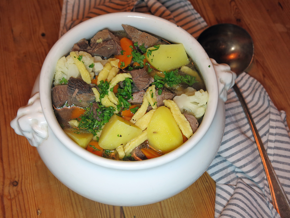 auf jeden Fall braucht man eine kräftige Rindsbrühe mit dem dazugehörigen Suppenfleisch, Spätzle und Kartoffeln.