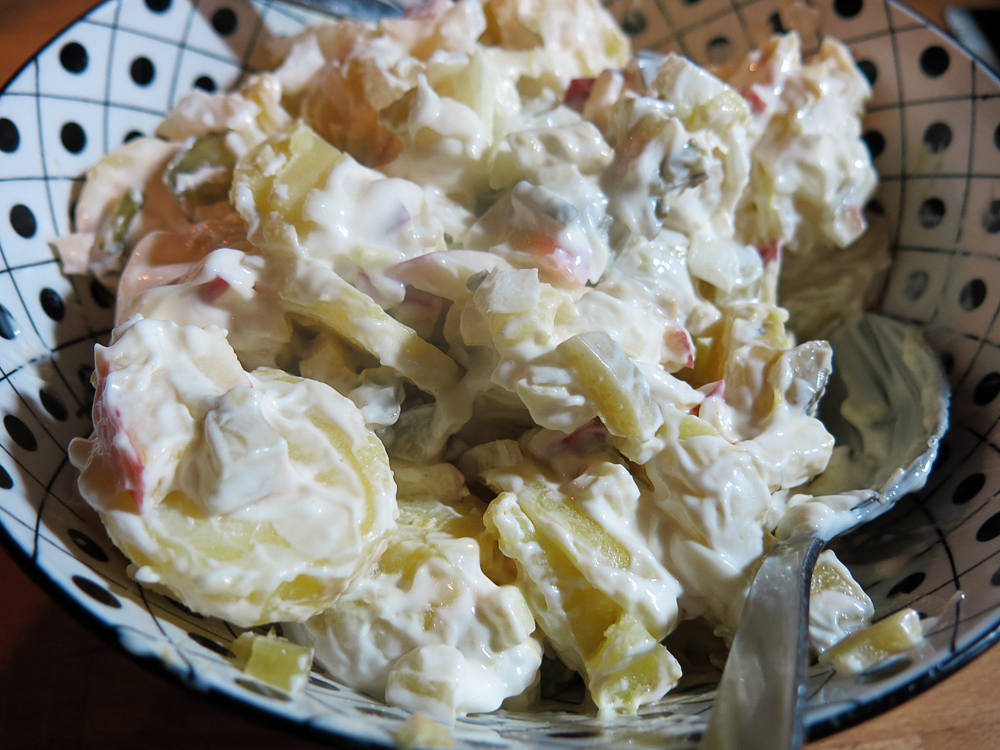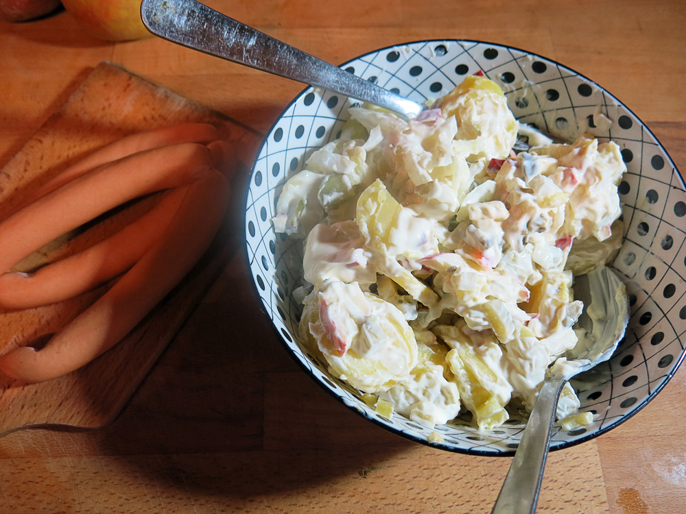 Wie gesagt, im Rhein-Ruhrgebiet macht man den Kartoffelsalat mit Mayonnaise. Dazu kommen Gewürzgurken, Apfelstückchen und Zwiebeln. So ein Salat ist sättigend und mancher Orten ein beliebtes Weihnachtsessen am Heiligen Abend.