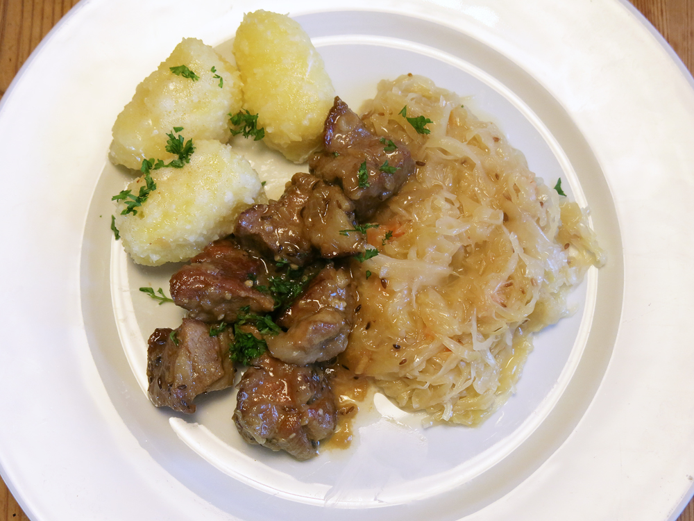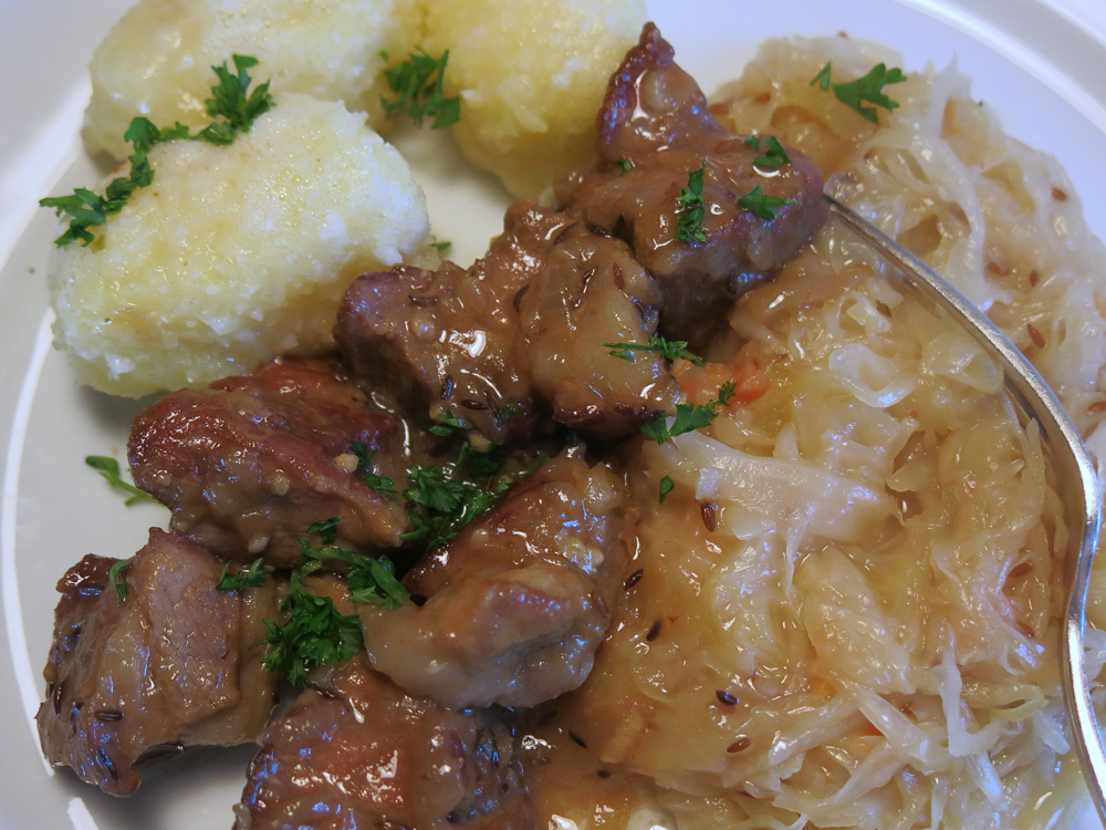 Zum Mährischen Spatz serviert man Kartoffelknödel, Sauerkraut, Rotkraut oder Spinat. An einem nasskalten Herbsttag mundet es besonders gut.