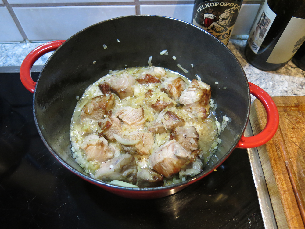 750–800 g Schweinebauch, -schulter oder -nacken (separat, gemischt aber alles ohne Knochen), 2 Esslöffel Schmalz, 3 größere Zwiebeln, 5 Knoblauchzehen, 1 Teelöffel Kreuzkümmel, 1 Esslöffel Senf, 1 Teelöffel Salz, 1 Teelöffel Mehl, 1 Glas Bier