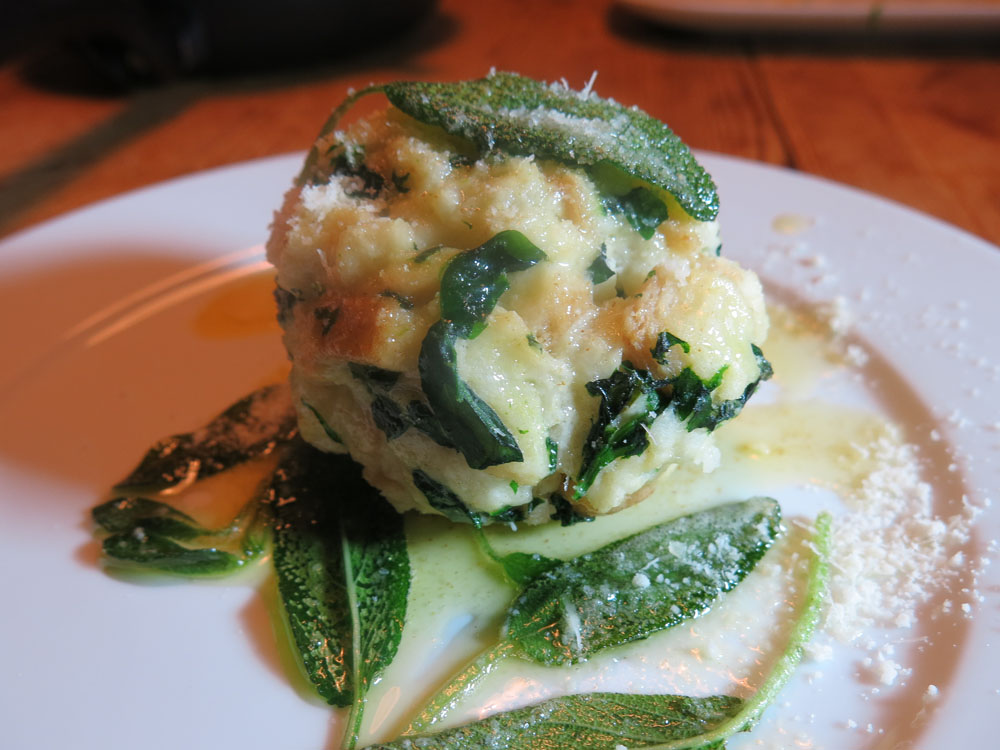 Dazu gibt es diesmal einen Hauptgang aus dem Trentin: Strangolapreti – oder wie es auf Deutsch heißt: Priesterwürger. Für den seltsamen Namen gibt es unterschiedliche Erklärungen. Am besten gefällt mir die Interpretation vom Priester, der als Gast eingeladen, so viele Klößchen hintergeschlungen und gewürgt hat, als er nur konnte.
